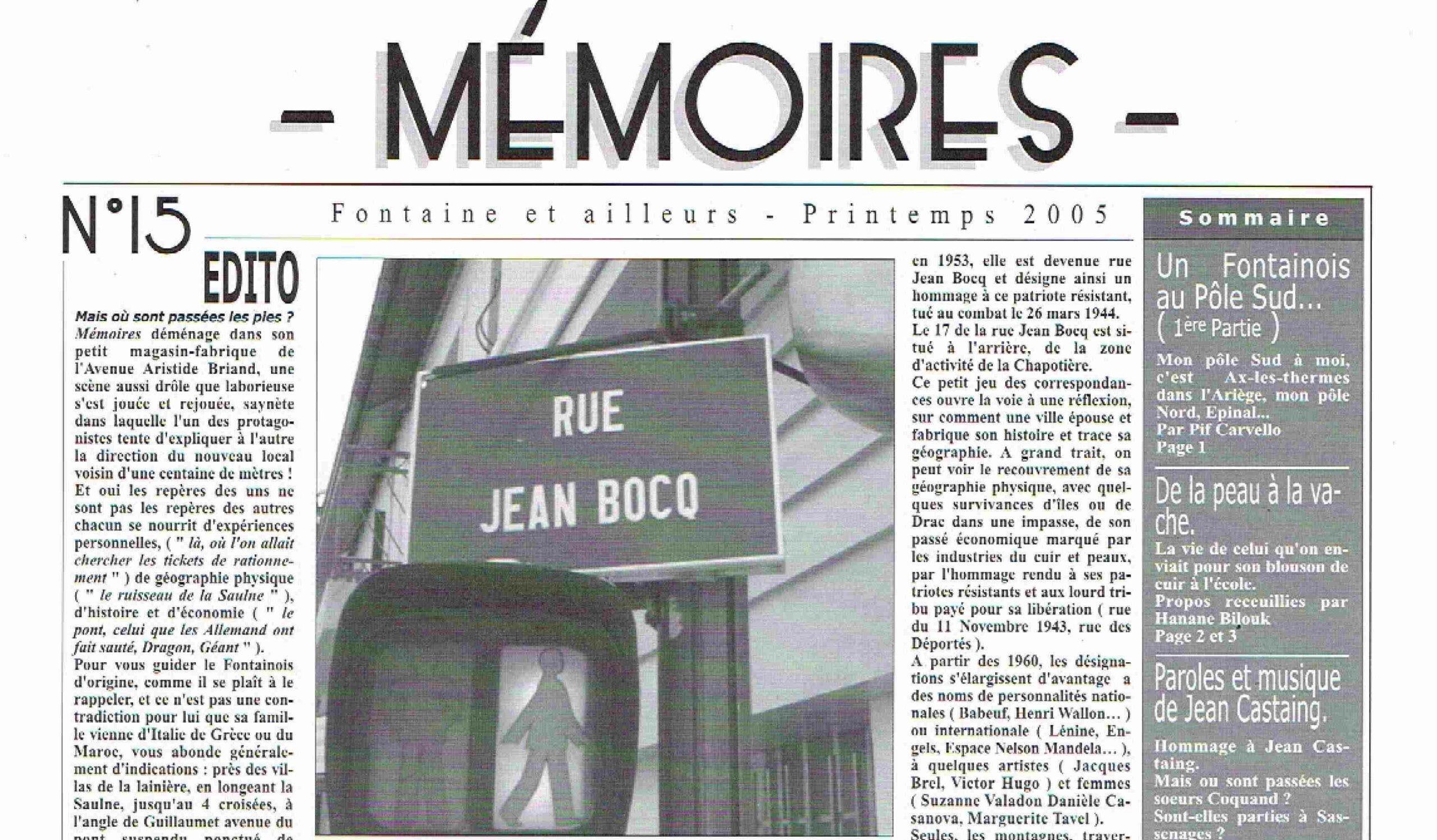 Déménagement de « Mémoires » à la rue Jean Bocq, illustrant les difficultés et richesses des repères géographiques et historiques à Fontaine. Le renouvellement des noms de rues, mêlant mémoire résistante et évolution urbaine, complique la transmission de mémoire collective. Article introductif sur René Broglio, un Fontainois à l’engagement syndical et une vie professionnelle marquée, préparant son récit d’expéditions polaires.