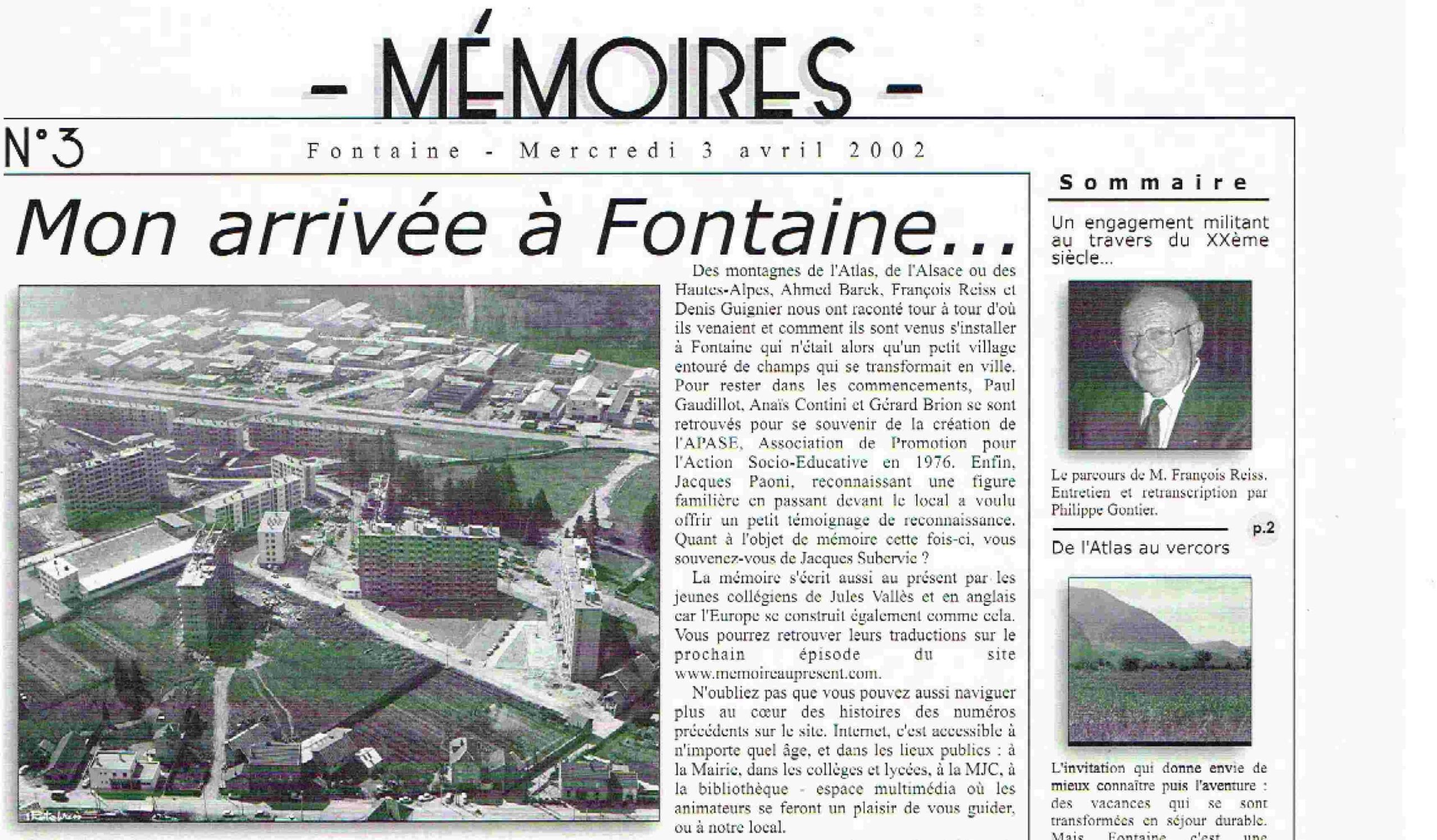 Ahmed Barek, né au Maroc en 1933, raconte son arrivée en France, son installation à Fontaine en 1960, et ses engagements associatifs, notamment dans l’ASMI (Association de Solidarité des Marocains de l’Isère). Il évoque la transformation rapide de Fontaine, d’un village aux champs à une ville avec de nombreuses constructions et le recul du travail ouvrier industriel.